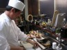 刺身を盛り付ける安藤さん、 この日のために白衣を新調して くださり気合充分。丁寧な包丁 さばきで魚を盛り付けるその手 は強くしなやか、この絵からは 設備屋さんには見えませんねぇ。