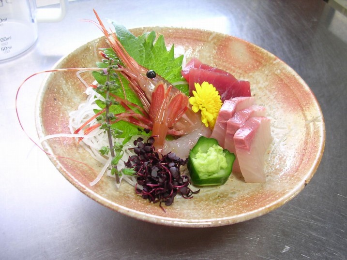 こちら、メインのお造り、 魚は牡丹海老、鮪、間八です。 ツマも豊富に盛り付けられて とてもきれい。器はかまなりや 製焼き締め高杯、足が高くて 刺身に似合いです。