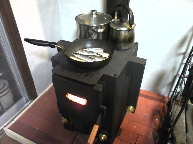 薪ストーブを備え付けて以来、初めてペレットタン クを外して天板で調理をしてみました。鍋を置いて 蒸し物をしながら、フライパンで秋刀魚の干物を 焼きました。