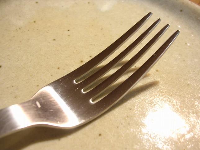 ナイフは小刀や小包丁とでも呼べば よかろうかと思いますが、フォーク は困ります。肉刺しと訳す向きも あるようですが、パスタの国イタリア から広まったとされる巻く用途の 道具をただ刺すという言葉だけで 片付けるのは少々煩雑かと思います。語源は熊手を意味 する 『furca』 であるらしいので、熊手でも良いのですが そのままでは知恵がありません。そこでやはり匙の仲間で すから、形状から鍬や鋤を連想し、鋤匙とか鍬匙というの が良いのではと思います。しかし鋤鍬は平たいものも総称 しますので、櫛形状を尊重するならば櫛匙なんてのも良い でしょうか。個人的には、先の本数から4本鍬のことを千葉 茨城あたりでは、まんのう(万能)と呼びますので、まんのう さじ若しくは、ばんのうさじなんていうのが好ましく思います。