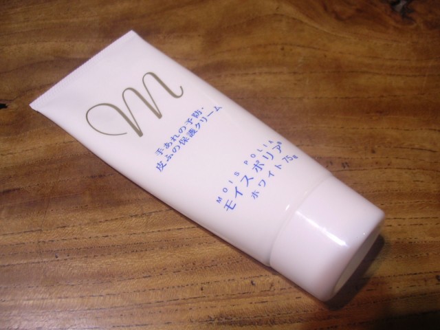 これがそのハンドクリームです。 日本ケミファ製のモイスポリア ホワイト、荒れた手を治すとい うよりは、荒れないように保護 する薬です。キャッチフレーズ は 『透明手袋』 白いクリームは べとつかず、塗ってすぐサラリと乾きます。手に馴染ん だあとは水をはじき、しっとり感が持続、半日に一度 塗る程度で乾燥を防ぎます。ロクロを挽いたり、釉薬 をかき混ぜたりしてもしっとり感は保たれ、その後手の 乾く仕事をしても罅割れません。近所のFUJIスーパー でダンボールを扱っている人たちの高評価を聞きつけ、 試供品を持ってきてくださった方がいて、試しに使って 驚きました。すぐさまネットで買いました。画像は75g の物で、アマゾンでは900円ほど、お値段も手ごろです。