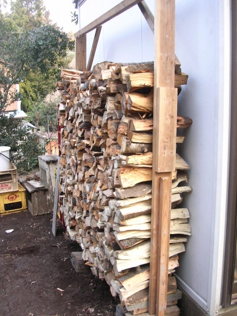 新吉田町の方から、立派な木を沢山 頂きました。近所の木を倒したもの らしく、太くて良い木でした。昨日の 晴れ間をこれ幸いと、倅の友達たち に手を借りて割りました。ででんと 積みあがった薪はまだズブナマです が、とても良い香りがします。即席 で薪置き場の木枠を拵えましたが、 材料に乏しく、いかんせん華奢です。家人が癇癪を おこして張り手でもすれば、たやすく崩れてしまうで しょう。朱色の墨で大きく 『テッポウ厳禁』 と書いて おきましょう。