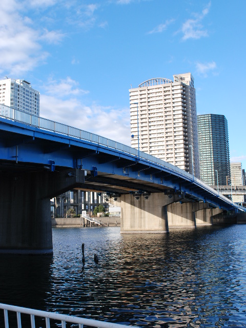 向こうに見えている橋が、勝鬨橋です。 勝どき橋は、月島から築地へとかかっている橋で 佃をうろうろするのがだいすきなわたしは、 何度もこの橋を渡っています。 昔は、跳ね橋だったそうで 橋の中央あたりに、それを操作する近代建築が残っていて とてもすきな橋です。