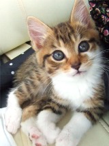 メス:美流來丸(みるくまる) 三毛猫のような、トーティのようでもあり、側面にタビー柄の入った変わった 毛色の猫。先輩のメス猫・虎流來丸(こるくまる)に似せて名を与える。