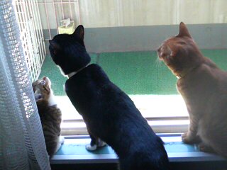 我が家のオス軍団揃い踏み。未だボス不在の我が家なれど、この中から強靭な 大将が誕生するだろうか? 何かを狙っているようだが、モコの目線だけ激しくズレてる。(笑)