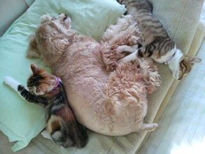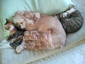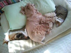 亜門はちょっと鬱陶しいみたいなんだが、とにかく気が優しくて当たりの柔ら かい亜門のことを2匹は大好き。 普段は寄っていくと迷惑そうに逃げちゃうので、亜門がグッスリと眠ったのを 見計らって2匹が寄り添っていく作戦ですな。