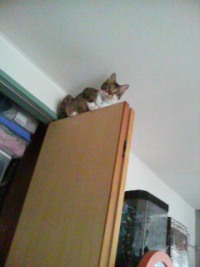 やはり最後の引っ張り上げで相当苦労をしてたようだが、晴れて『新世界』へ 到達。 最終的にはクローゼットの引き戸の上にちょこんと座ってご満悦。