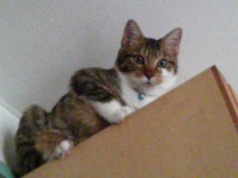 これは少し前の写真だが、ある日ミルクがこの位置で上を見ながらソワソワし、 少し小声で鳴いたりもした。 こういう時は仔猫の成長が見れる瞬間。(ウキウキ) しばらく後、ミルクはとぉっ!ってな具合にケージの上までジャンプした。 多少危なげながらも成功。(ホッ)