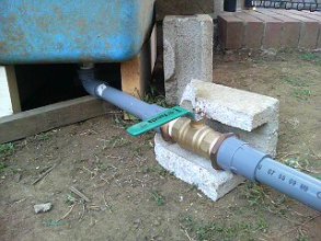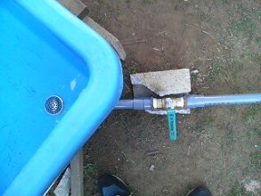中央にあるコックを捻れば、庭の雨水枡まで勢いよく排水される。 なーんもしなくて良い。 水が無くなりきる前に、デッキブラシでもって容器の壁面や底面の汚れを落と していれば、ハイ終了。