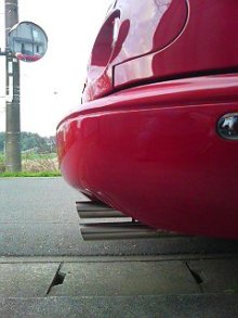 でもね、良いこともあるんす。 その際たるものがルックスかな。 今回のステッ管音も元の鉄管音以上に出口を長めに取ってある。 しかし、バンパにくっ付くように装着されていた為、その長さが強調されてな かった。 分かるかな?