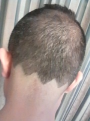 その超短髪だけじゃアクセントがないんで、ソリをブッ込むのと、項の部分に 両耳に渡る部分を三角のギザギザ線で繋いで貰った。