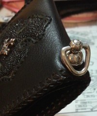 この財布にウォレットチェーンというものを付ける。 ウォレットチェーンってのは、読んで字の如くなんだが、腰にジャラっと鎖を 垂らしてる人を見たことあるだろう。あれだ。 で、このウォレットチェーン、昔が片端がクリップで片端はフックというのが 主流だったはず。 ところが最近のそれは両端ともクリップ仕様ってのが多くなってきた。 写真の財布にある銀細工の穴がフックを通して使うところなんだが、これでは クリップだと通らない。=両端クリップ仕様のウォレットチェーンは使えない ってこと。