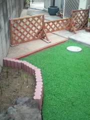 写真の緑の部分(人工芝)が犬ゾーンです。 以前は奥まで行けたのですが、行かせる必要もないので柵を置いちゃいました。