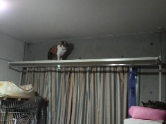 天井近くを左右に渡れる道です。 前から器用な仔はカーテンレールの上を渡っていたのですが、カーテンレール では耐荷重も心配だし、方向転換すらままならない状態でしたし。 元々ペット用ではないのですが、流用できそうな収納家具を使っての設置です。