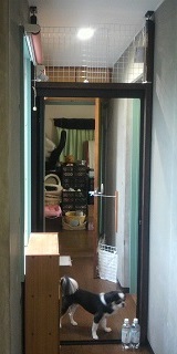 まだ完成ではありません。 上部の飛び越え防止の柵は仮モノです。 下の突っ込み防止の網も作らなくてはなりません。 猫って静止している物への視力は余り良くなく、網戸程度だと走り 突き抜けて行ったりしますから(笑)。