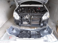 作業はリアバンパーに続いてフロントバンパーも外しての交換作業。