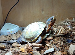 一度掘り出してしまえば、餌を見つけるや否やガッツクので、冬眠はして いないと思います。 眼の輝きも爛爛ですしね。 食後は画像の通り、紫外線灯の下で暫くバスキング。 その後、水場に入ることもありますが、ほぼ湿った地面を掘りだし潜って しまって、もう出てきません。