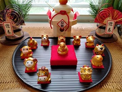 玄関に飾る正月飾りです。 確か、2・3年前に完成しました。 完成って書いたのはこれも収集癖あってのことだから。 セットで売られている物では無いんです。 実は各干支の金色の置物は、年末に店舗に良く並ぶ小さな鏡餅の上にセット されて売られていたものです。 どこかの年で気に入って、そこから12年かけてコンプリートしました。 12年の間、売られている店を探して。 12年の間、無数に置いてある鏡餅の中から、塗りなどがズレていないのを 探す作業をして。 12個揃って、初めて飾るためのその他アイテムを買ったり作ったり。 これが私の場合の癖です。 欲しい、集めたい、欲求が長い間燻ぶり続けるタイプの収集癖。 実に質が悪い(笑)。
