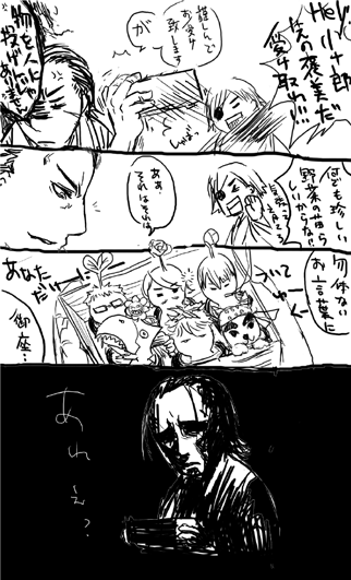 れんげさんちに「ぐらんぱぴyなんでもありませんネウロ」(これぞまさに食人虫植物) karugamoさんちに「銀魂の坂田さん」(迷惑な感じに婿入りさせてみる)(婿って言うか庭に埋め、、、簀巻きか簀巻きなのか) 女帝んちに「例の眼鏡」(どのめがねだよ)(芹沢甲子太郎みたいな名前の)(逆それ逆!!) 相方んちに「タイクラ4ジョルノ」(欲しがれば良い思う様暴走したまえよ!!)(ニヤニヤ笑いで)(いやなおとな) いまもっさんちに「おいでよバサラの森verのわんこ」(尻尾ばっふんばっふん振ってらー!!に撃沈したんですが拍手送れてなかった模様、、、ι)(いつの話それ) かこさんちに「木島日記の根津kなんでもありません銀魂の土方さん」(さすがに根津君だと「かゆ、、、、うま、、、」しか言ってくれなさげなので全気力振り絞って回避。とっしーでも良いですよ!)(てゆかうわー!!リクエスト何にしようか本気で悩んでるうちに募集おわっ、、、終わって、、、、!!!!(膝からくずおれ)あと忍者に例えて下すってありがとう!忍者ってもかなりの確率でにんたまのはんべ(外見)ですけどね!(私信)