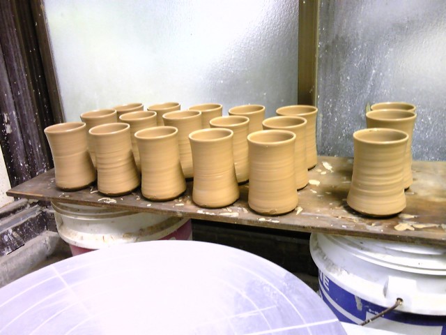 水挽きロクロは、多くの方が難しいと思っていらっしゃ るようですが、手の滑らせ方と力のかけ具合のコツさえ つかめば、厚みを整えたあとは広げたり縮めたりしてい るだけですから、むずかしい技術ではありません。その 技を使っていかに自分の表現にするかという製作理路の 構築が一番の勘所だと思います。良いか悪いかなんての は作る側も主観的ですし、見る方がそれをどう思うかは さらに主観的、あとは同調してくださる方と良い出会い があるかどうかです。この作品たちも無事に焼きあがっ たら、そういった良い方に縁付いて貰われていって欲し い物です。