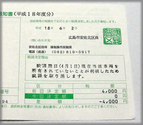 陸運支局に電話して電話を回してもらう。 訳を言うと担当者は 「そりゃぁ、名義が変わっていないんでしょう。譲渡した人に連絡して名変してもらわんと、ず〜っと税金の請求がきますよ」 と、にべもない。