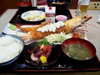 とりあえず煙草と比べてみましたが。後ろにいる海老は熊野さんが頼んだ普通の海老フライ。小さく見えるけどそれなりの大きさだと思う。 ちなみに奥にある黒い器には海鮮丼が。さすがに鎌倉の海鮮丼よりは具が薄いけれどその分お値段もリーズナブル。
