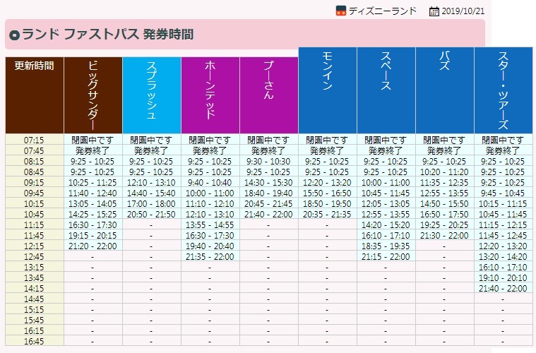 6:59 駐車場着 7:02-9:26 新安城〜東京 9:39-9:55 東京〜舞浜 10:28 入場 10:38 お茶 10:40-12:02 バズライトイヤー(80) 12:18 ティポトルタ 12:25-12:55 フィルハーマジック 13:00-13:20 アリスのティーパーティー(15) 13:25 パンケーキサンド(おひるごはん) 14:01-15:30 ビッグサンダー(90) 15:41-15:59 ウェスタンシューティングギャラリー(5) 16:10-16:35 ハングリーベアーレストラン(よるごはん) 16:38-16:59 ウェスタンシューティングギャラリー(5) 17:07-18:55 ホーンテッドマンション(90) 18:55-19:10 アリスのティーパーティー(15) 19:28-19:38 牛カルビコーン 19:45-20:13 モンイン(40) 20:20-20:45 スターツアーズ(5) 21:10-21:30 スペース(FP) 21:40-22:13 スプラッシュ(FP) 22:19-22:34 写真撮影とか 22:34 ランド退場 23:29 ホテル内ローソン