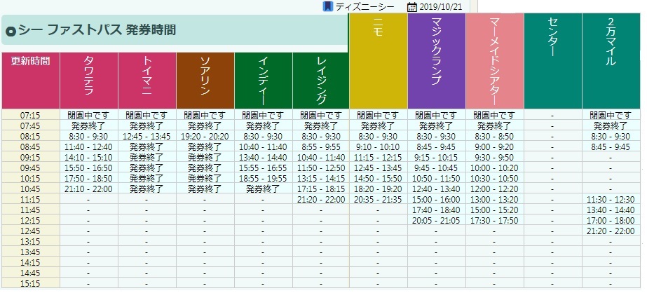 5:15 ホテル出る 5:40-8:00 待ち 8:00 入場 8:13-9:10 ソアリン(45) 9:17-9:55 マグダックスデパートメント、ヴァレンティーナススイート買い物⇒コインロッカー 10:06-10:30 トイマニ(FP) 10:45-12:00 カフェポルトフィート(おひるごはん) 12:06-14:42 タワテラ(120) 15:12-16:28 ニモ(110) 16:39-16:58 スモークチキンレッグ 17:05-17:26 インディ(FP) 17:30-17:45 2万マイル(FP) 17:50 プロメテウス火山噴火撮る 18:10 スペシャルマンまん 18:22 トリトン王とソラ撮る 18:50 コインロッカーで荷物回収 19:00 かえる 20:26-22:58 東京〜新安城