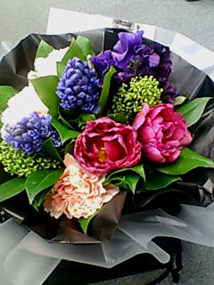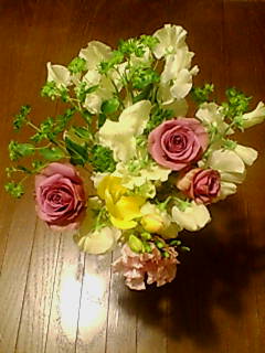 下の写真は、会社の後輩N嬢が贈ってくれたお花です。 …泣かせてくれちゃって、もう… この思いに報いるべき言葉を、今の私ではとても思いつきません。 とってもきれいで、いい香り。 帰宅して、自宅のテーブルの上に飾りました。本当にありがとう。
