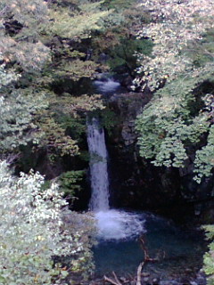 満腹でご機嫌になって、四万川沿いの道路を登り、上流にある「奥四万湖」というダム湖を目指しました。 その途中にある「小泉の滝」です。