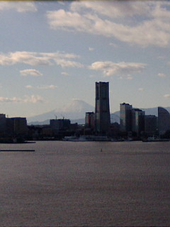 鶴見駅に戻って今度はバスに乗り、ベイブリッジへ。時間がたっぷりあるので、今までなんとなく憧れつつ行く機会がなかったところへまとめて行ってみようと思ったんですが、これまた大当たりでした。素晴らしい好天で、最高の眺望。 ベイブリッジのスカイウォーク(道路の脇の歩行者専用通路)から眺めるみなとみらい方面です。背後に富士山がどーん!!