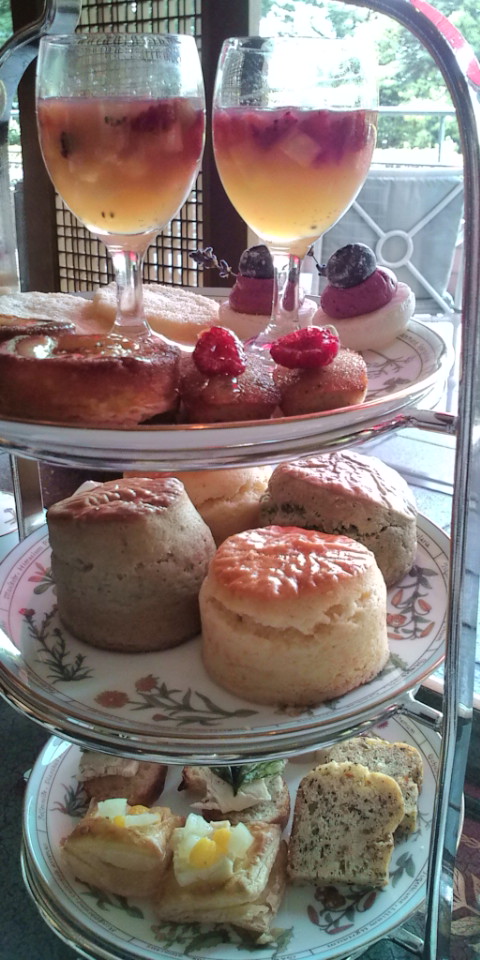 で、アフタヌーンティーのお菓子。(画像でっかくてすみません) 中段の緑がかっているのがよもぎのスコーン。あずき入りのクロテッドクリームをつけていただきます。美味。