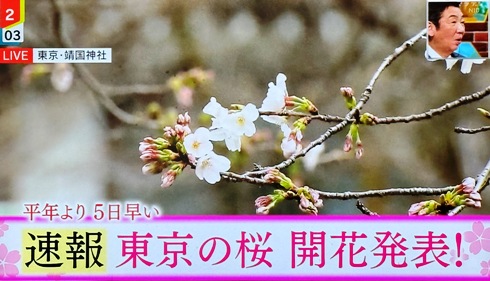 東京管区気象台が、東京都心で桜が満開になったと発表しました。 平年より3日、昨年より2日早い。靖国神社 ( 千代田区 ) にあるソメイヨシノの標本木で、おおむね8割以上が咲いた状態という満開の基準を満たしたのだそうです。