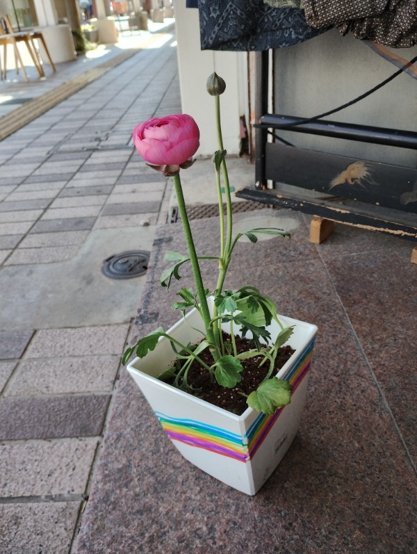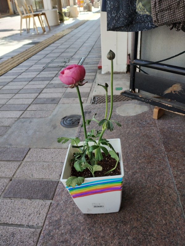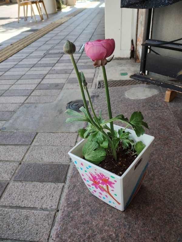 想い想いの絵を描いた鉢植えにお花を植えて中央商店街のお店にプレゼントしていただいた。