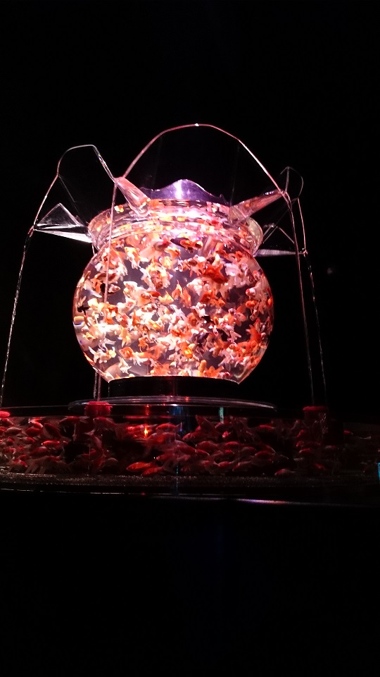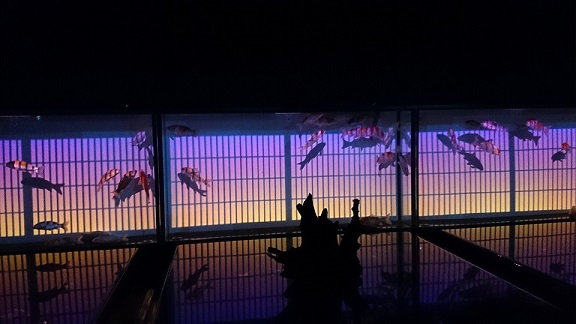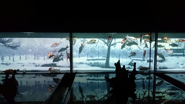 一番上と2番めは、プロジェクションマッピングで背景が変わります。 四季の移り変わりの中を金魚が泳ぐ。