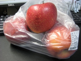 …なに、この、フリッターの出来そこない。ポテイトはメンドイから冷凍ので済ませる。何か上げた瞬間からもこもこし出したからイヤな予感はあったのだけれど…う〜む。口に合わないからと家人に分けてみたら旨いいうから、決して間違っていたワケではなかった模様。ただ、個人的に口に合わなかっただけなんだろうナ。まァ、これといった名物のない国のファーストフードだもんなあ。りんごが切れたのでそれも買っておく。