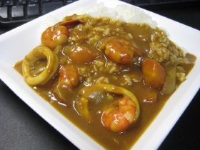 昨日のカレー。めずらしくシーフードだっタ。イカと尻尾付きのエビが入っていタ。で、今朝もカレー。朝から、カレー。