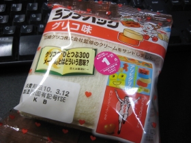 とにかくどんどん新アイテムが出てくるランチパック、今度は「グリコ味」と来タ。グリコ監修のクリームをサンドとあるけれど、グリコいってる時点で味は想像出来るヨなあ。そして、予想通り。