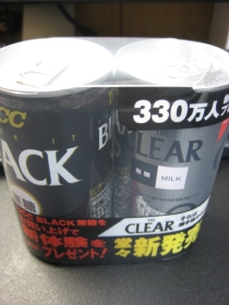 ブラックを買うと新商品がオマケで付くというモノ。なるほど、値段はしっかり1本分の88円になってる。ブラックは基本、飲まないし、新商品の方もミルク入りとはいえ無糖だからなあ。