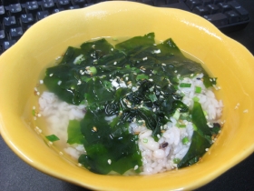 小腹が空いたので香ばし十五穀で炊いたご飯にわかめスープをふりかけ、お湯を注いで頂く。