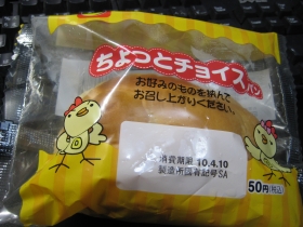 ・ちょっとチョイスパン 小麦粉、糖類、マーガリン、卵、パン酵母、脱脂粉乳、 食塩、牛乳、植物油脂、発酵風味料、植物性加工油脂、 ナチュラルチーズ、たんぱく質濃縮ホエイパウダー、 還元水あめ、乳化剤、イーストフード、香料、V.C、(原材料の一部に大豆を含む)