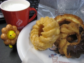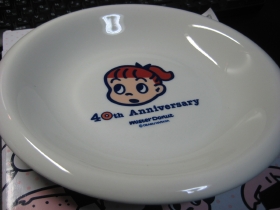 折り込み広告で知った40周年アニバーサリープレート。一瞬、スルーしようと思ったけれど、なんとなく欲しくなって来たので、さくっといいことがあるドーナツ屋さんへ。いつもの広告効果か、混雑、混雑。惣菜系以外100円というので単純に10個買えばいいのだけれど、そんなに食べないし、値段高めなゼリーとかあればいいけれど、まだシーズンでもないしで困っタ。結局、惣菜系入れて8個ほど適当に選び、足りない分はいつもは断っているドリンクからプレミアムアイスカフェオレで。