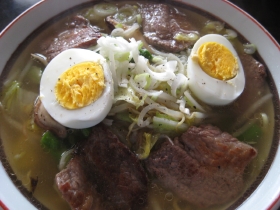 四角い、ソース練り込み麺だって。個人的には肉そぼろと綺麗に食べられるのが気に入っタ。高いけど。