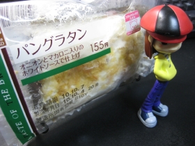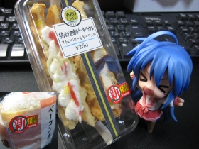 いい気分なコンビニではいつものごとく、スイーツ(笑)漁り。もちモチ食感のケーキワッフル(ストロベリー&キャラメル)。印象は…イマイチ残ってない。一緒にベーコン巻おむすびも。