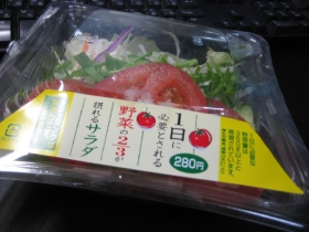 オシャレっぽいサラダをフレンチドレッシングで頂く。マチのほっとステーションでは、こういうスイーツも確保。