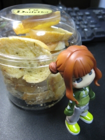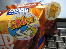 まァ、典型的なカップの味噌ラーメンということで。近所のコンビニでまたシールが面白いビスケットを漁る。
