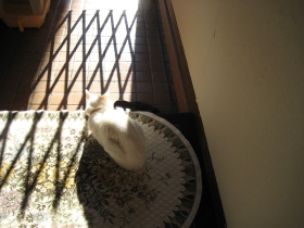 暖かいところは猫に訊け―――。ようやく家猫とかしたシロ♀。