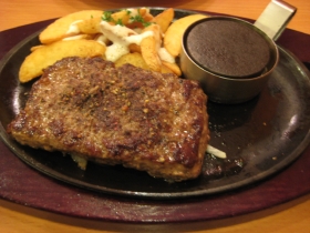 の、胡椒が効いた方、ペッパービーフハンバーグステーキ。添えられたペレットの上で半生のビーフステイクをジュウジュウ焼いて頂くですヨ。ライス単品も付けたけれど、なんだかステーキに夢中になって、いらない気さえしタ。おなかがいっぱいとうかいう意味ではなく、味とペレットで焼くという面白い動作で満足しちゃったという。ちなみに順位は1位を取ったオリジナルとは違い、こちらは11位のランク外。