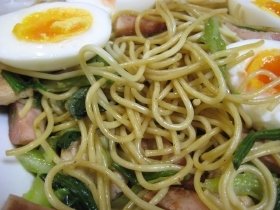 …最後だっタ。チーズ系はあまり旨くない記憶があるけど、めずらしくこれは旨かっタ。台所にあった和風系のスパゲッティ。