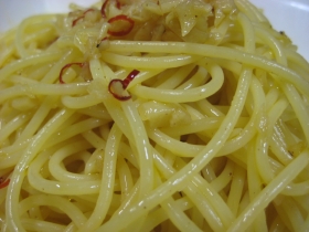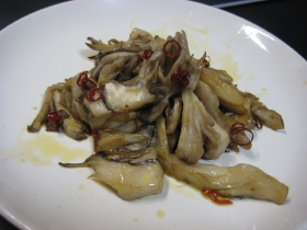 ようはオリーブオイルでいためたエリンギ。鷹の爪と一緒に炒めて塩を振っておしまい。…う〜む。